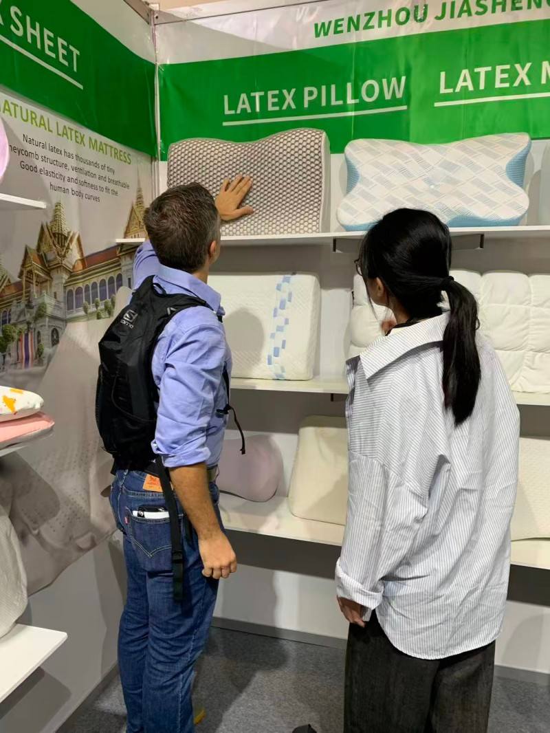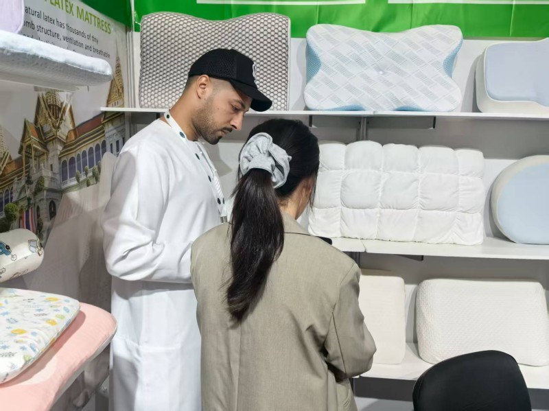 På denne søvnutstillingen i Dubai er vi beæret over å vise våre søvnfokuserte puter til besøkende fra hele verden. Vi er dedikert til å presentere to av de mest solgte putene på markedet:naturlig lateks puteog det moderne smarte materialetminne skum pute. Lateksens raske tilbakeslag og anti-allergiegenskaper er svært foretrukket av lateksentusiaster. I mellomtiden kan den ultimate passformen til minneskum gi dyp søvn. Vår dyptgående kommunikasjon med kundene på stedet fikk oss til å føle deres jakt på puter. Vi er overbevist om at det å gi personlige valg for ulike søvnvaner er nøkkelen til kvalitetssøvn.